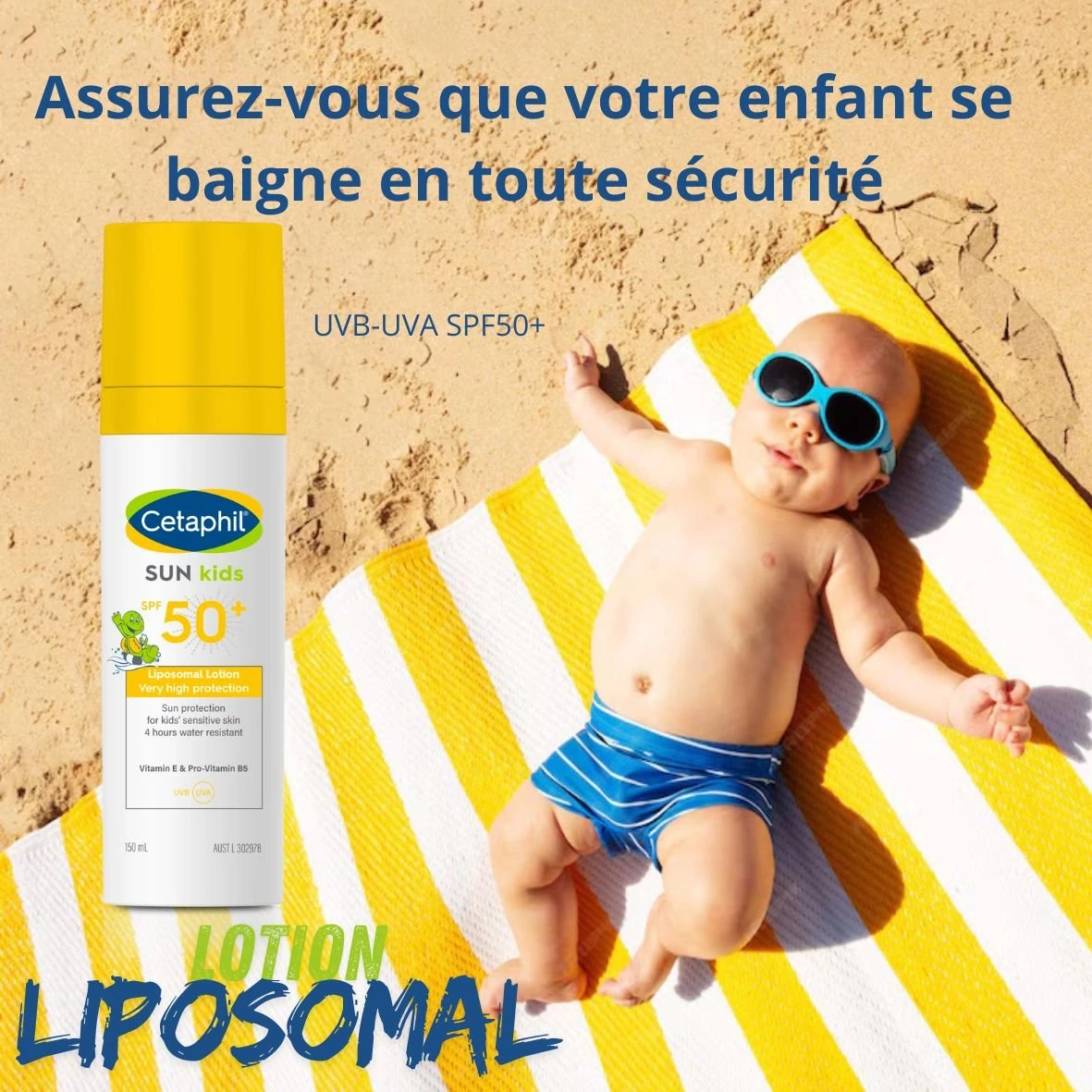 Lotion solaire liposomale pour enfants, formulée pour les peaux sensibles. Elle offre une très haute protection SPF50+ contre les UVA/UVB et hydrate durablement la peau délicate des plus petits.