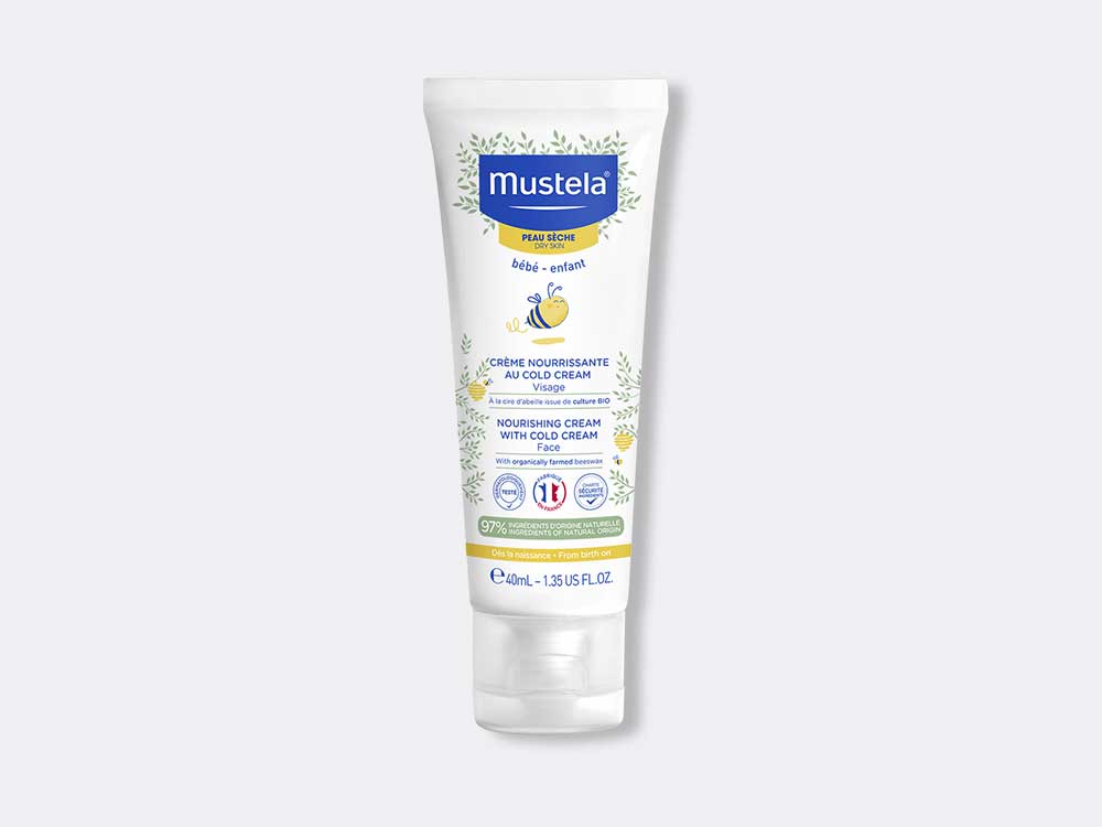 La crème nourrissante Mustela au cold cream protège la peau sèche du visage. Sa formule à l’avocat et à la cire d’abeille bio hydrate et apaise la peau des bébés durablement.