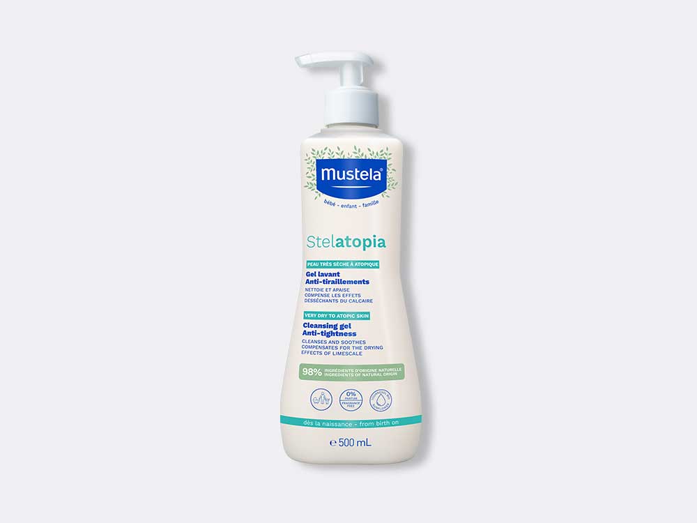 Le gel lavant Mustela Stelatopia nettoie en douceur et protège la peau très sèche ou atopique. Il apaise les sensations de tiraillement et laisse la peau douce.
