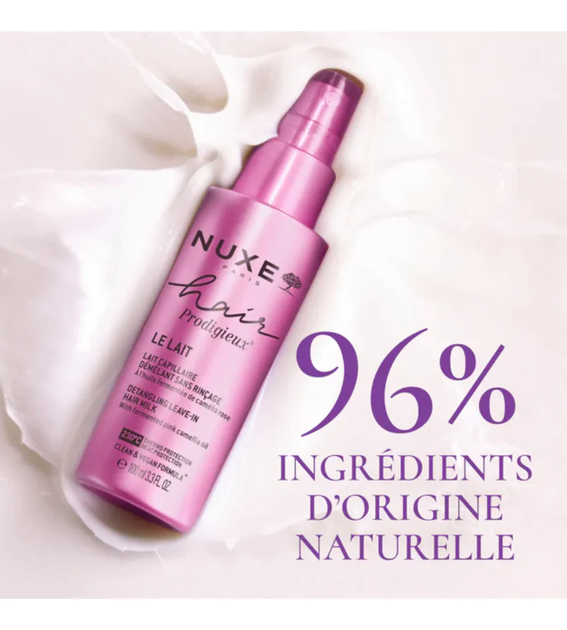 Nuxe Hair Prodigieux Le Lait : lait capillaire à la fermentation de camélia qui sublime, nourrit et démêle instantanément les cheveux.