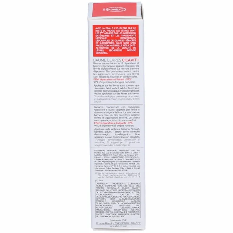 Le baume protecteur SVR Cicavit+ Lèvres est spécialement conçu pour réparer et protéger les lèvres abîmées, gercées ou irritées. Sa formule riche et nourrissante offre un soulagement immédiat et favorise une réparation accélérée de la barrière cutanée fragile des lèvres. Idéal pour les lèvres exposées aux agressions extérieures telles que le froid, le vent ou le soleil, ce baume est un allié indispensable pour retrouver des lèvres douces, souples et confortables.